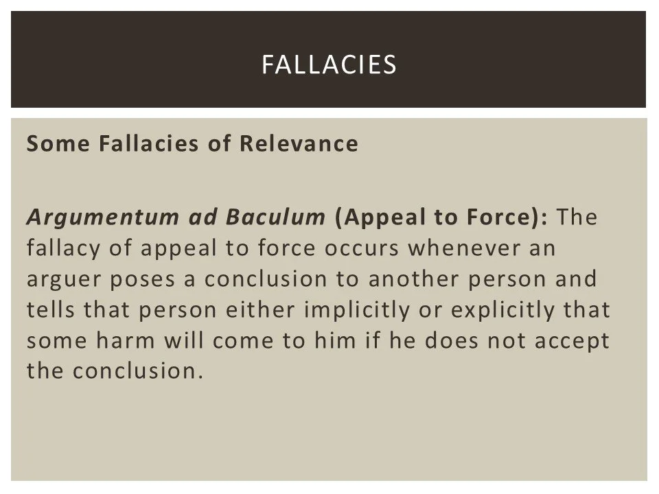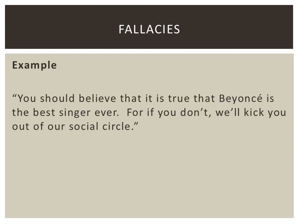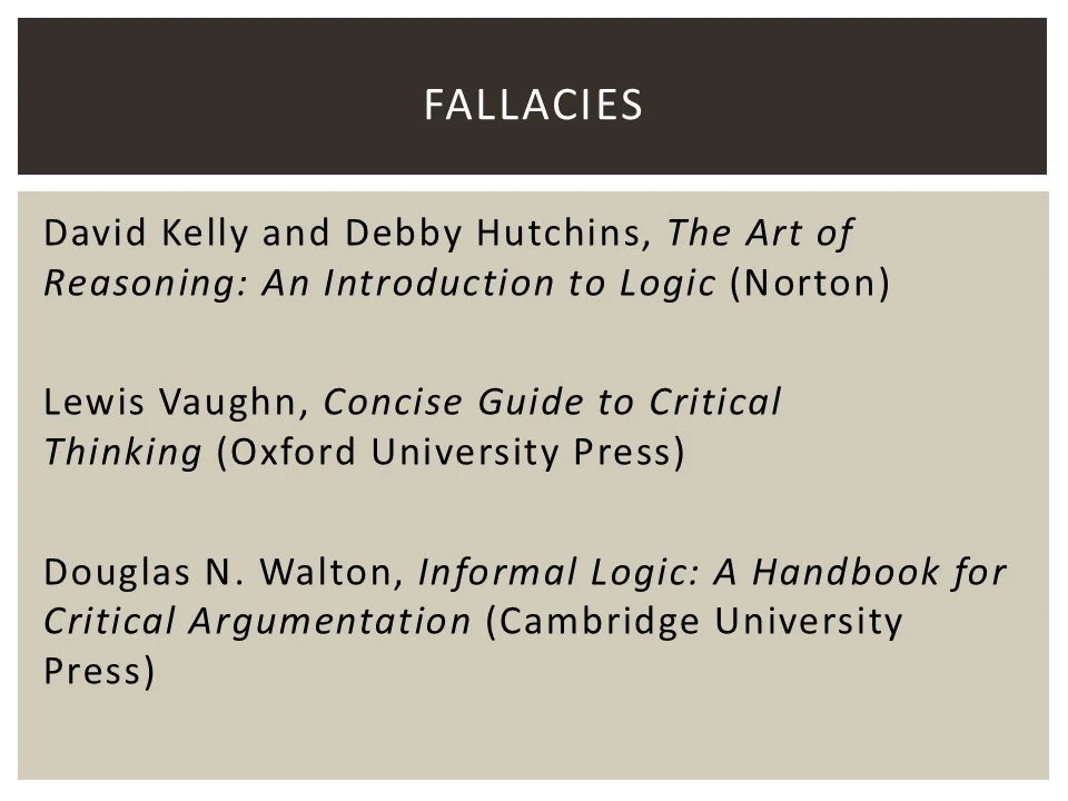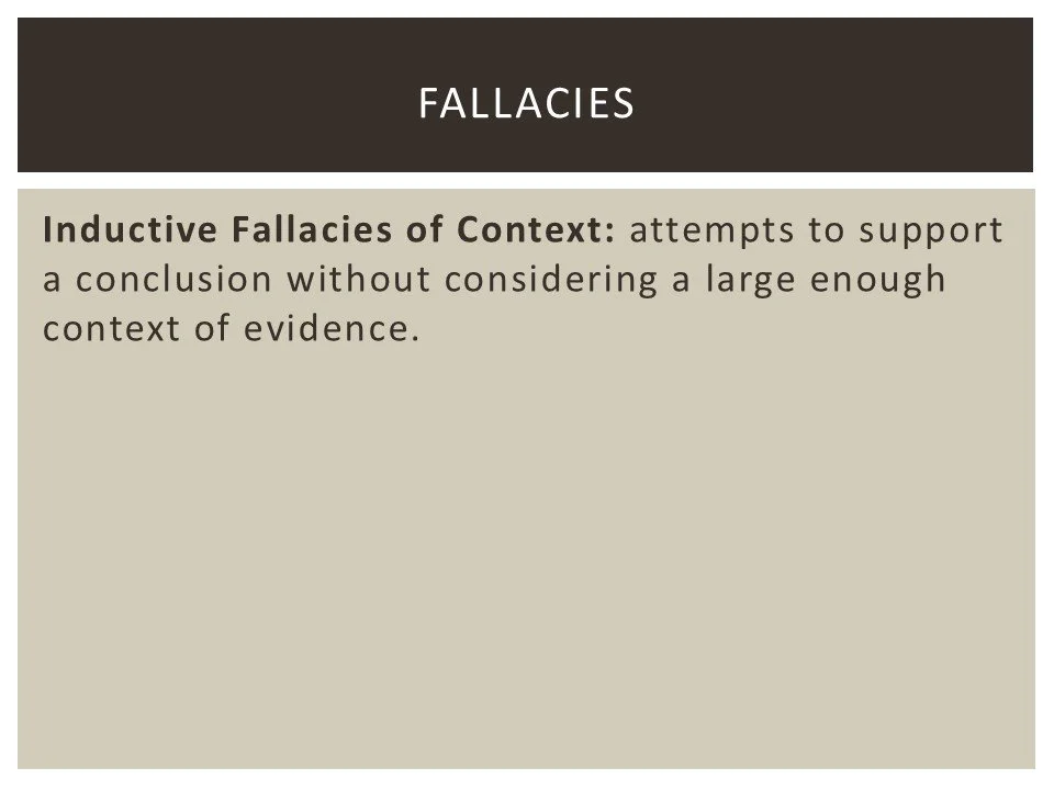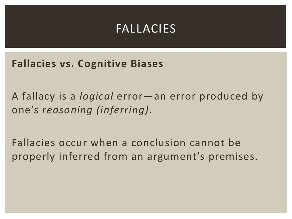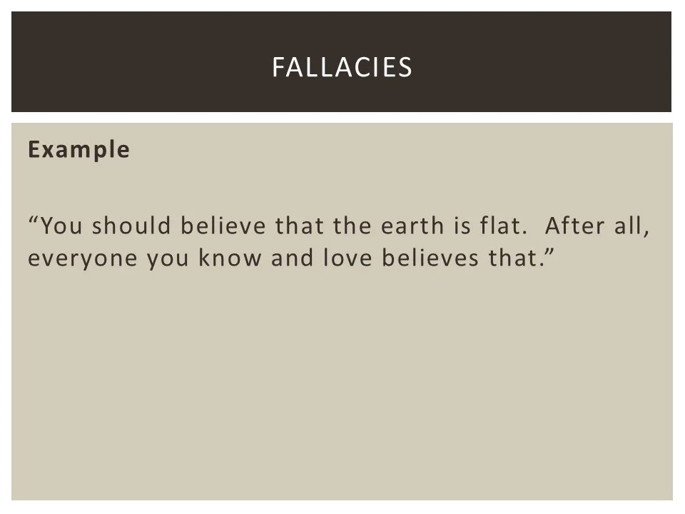The following are excerpted from the set of PowerPoint slides on fallacies. They are representative of the substance and style of all of the PowerPoint slides that are screen-shared and discussed during the course. Discussions of the course’s PowerPoint slides include presenting arguments for positions on bioethical issues, analyzing the concepts presented therein, explaining the importance of said concepts, and more. Throughout these discussions, Professor Lovering encourages students to participate by sharing their questions, observations, insights, confusions, anecdotes, and anything else (that is topic-relevant) that comes to mind.