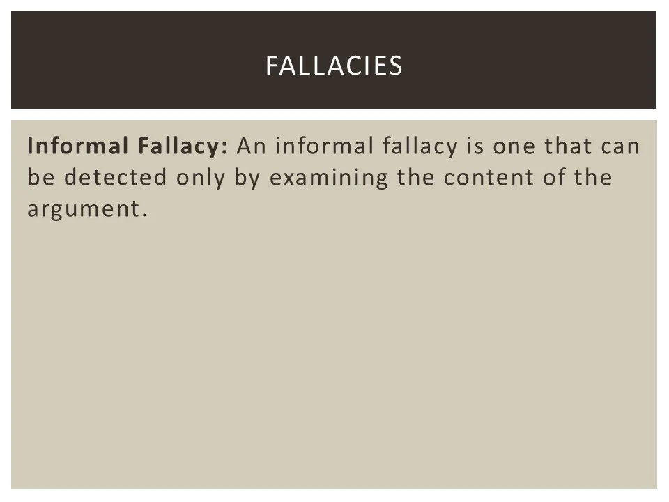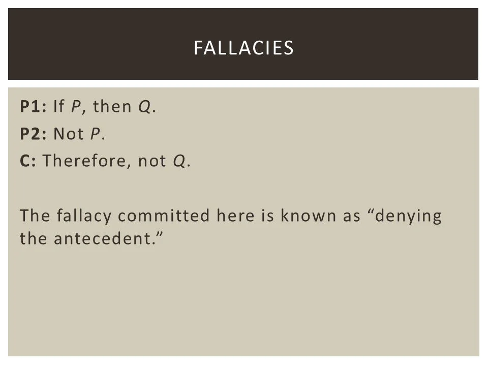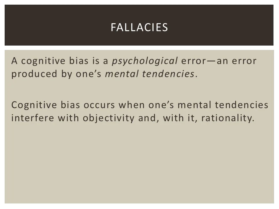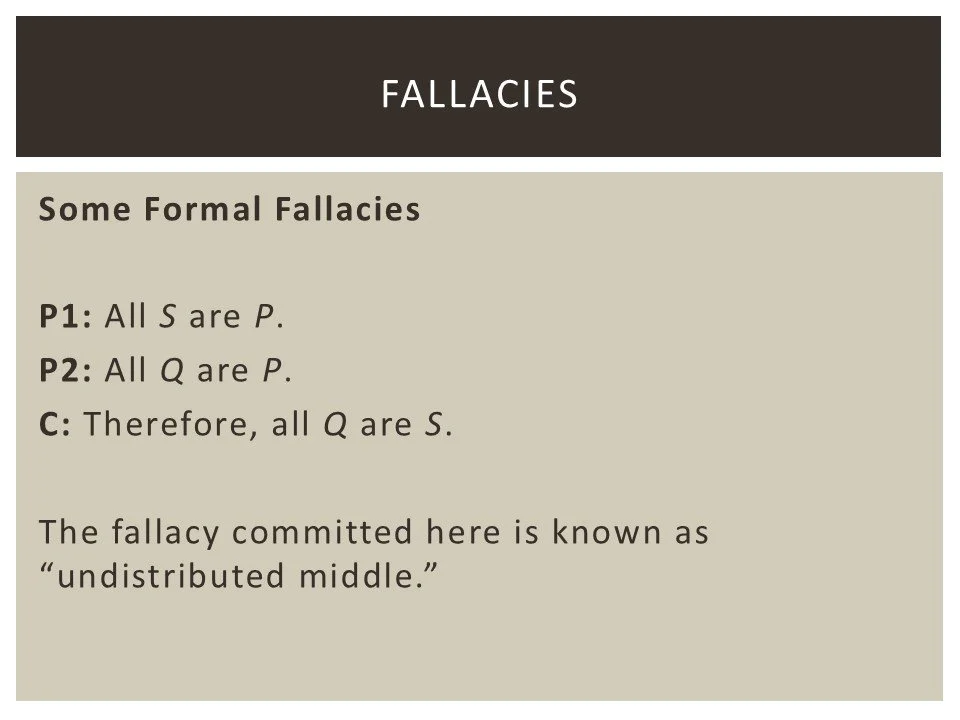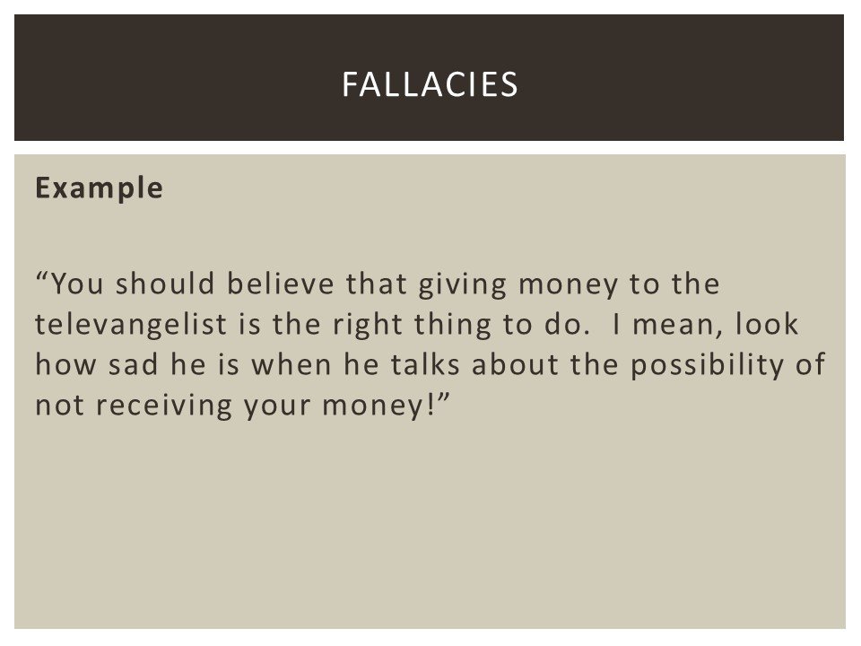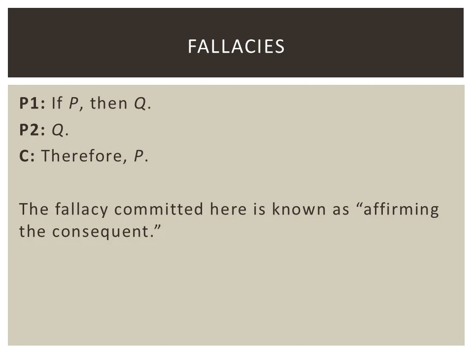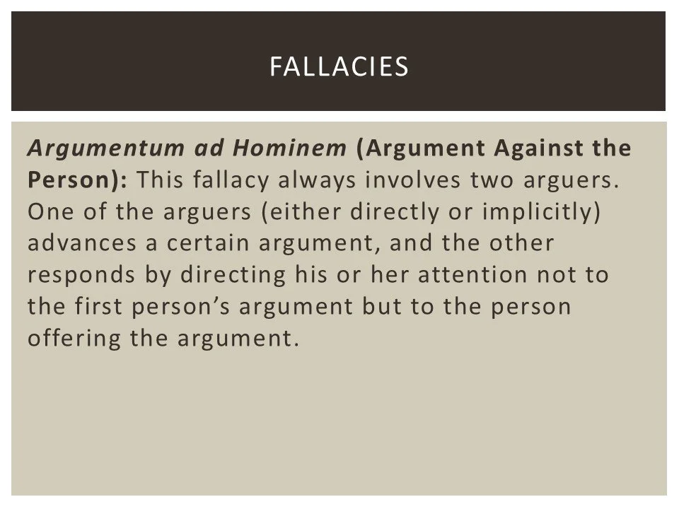 The following are excerpted from the set of PowerPoint slides on fallacies. They are representative of the substance and style of all of the PowerPoint slides that are screen-shared and discussed during the course. Discussions of the course’s PowerPoint slides include presenting arguments for positions on bioethical issues, analyzing the concepts presented therein, explaining the importance of said concepts, and more. Throughout these discussions, Professor Lovering encourages students to participate by sharing their questions, observations, insights, confusions, anecdotes, and anything else (that is topic-relevant) that comes to mind.